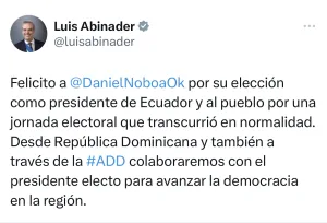 “Felicito a Daniel Noboa por su elección como presidente de Ecuador y al pueblo por una jornada electoral que transcurrió en normalidad. Desde República Dominicana y también a través de la ADD colaboraremos con el presidente electo para avanzar la democracia en la región” escribió Abinader en su cuenta de X.