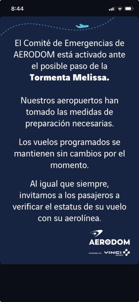 Panorama Nacional. Ante los posibles efectos del fenómeno atmosférico sobre el territorio nacional, la administración de los aeropuertos del Estado dominicano (Aerodom), informó que ha tomado las medidas de lugar, debido al paso de la tormenta Melissa.