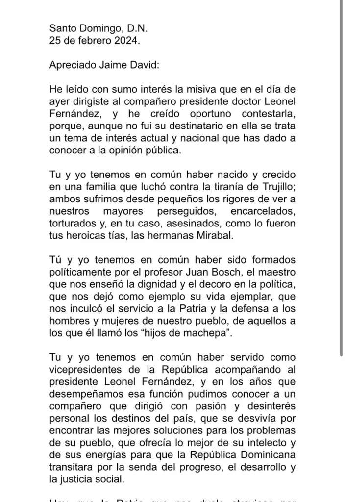 La carta de Alburquerque resalta la trayectoria de lucha y compromiso político compartida con Jaime David Fernández, así como la influencia del profesor Juan Bosch en sus vidas.