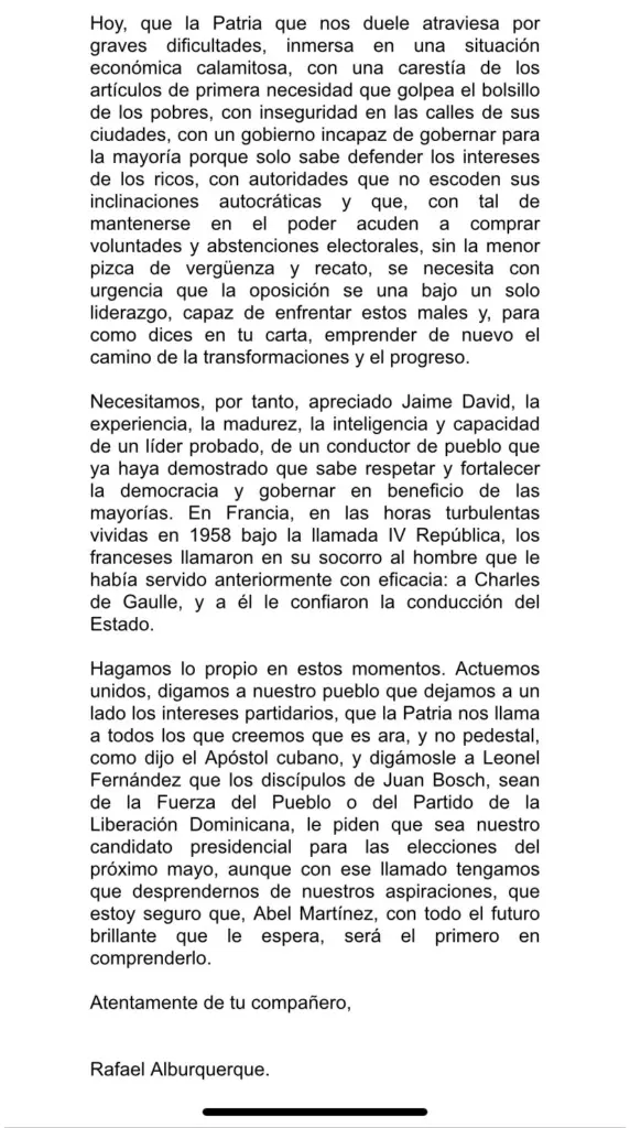 En la carta, Alburquerque resalta la necesidad de unificar fuerzas ante la coyuntura actual que atraviesa el país, caracterizada por «dificultades económicas, inseguridad ciudadana y un gobierno cuestionado por su gestión».