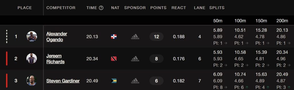 El esfuerzo del dominicano Ogando fue espectacular con tiempo de 20.13 segundos y cerrando delante de Jereem Richard, de Trinidad y Tobago.