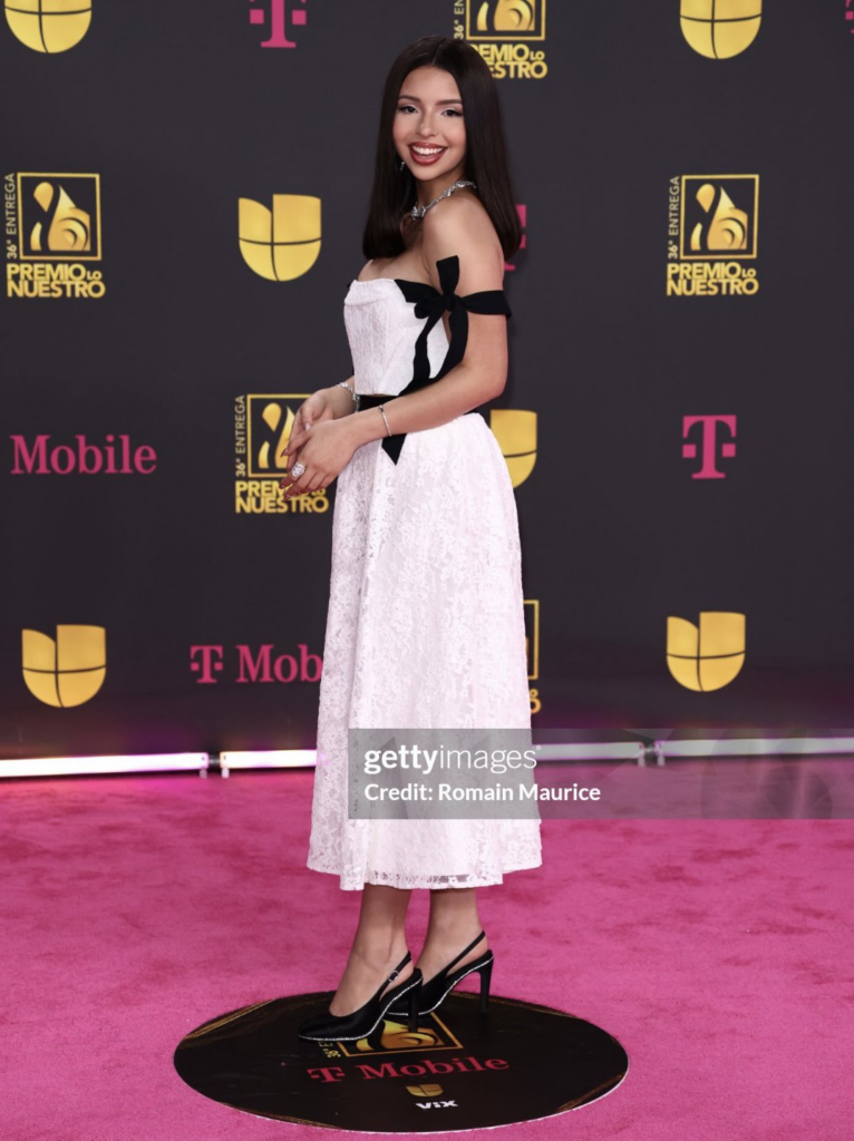 La mexicana Ángela Aguilar, quien sorprendió con extensiones, caminó por la alfombra con un vestido blanco con tirantes negros.