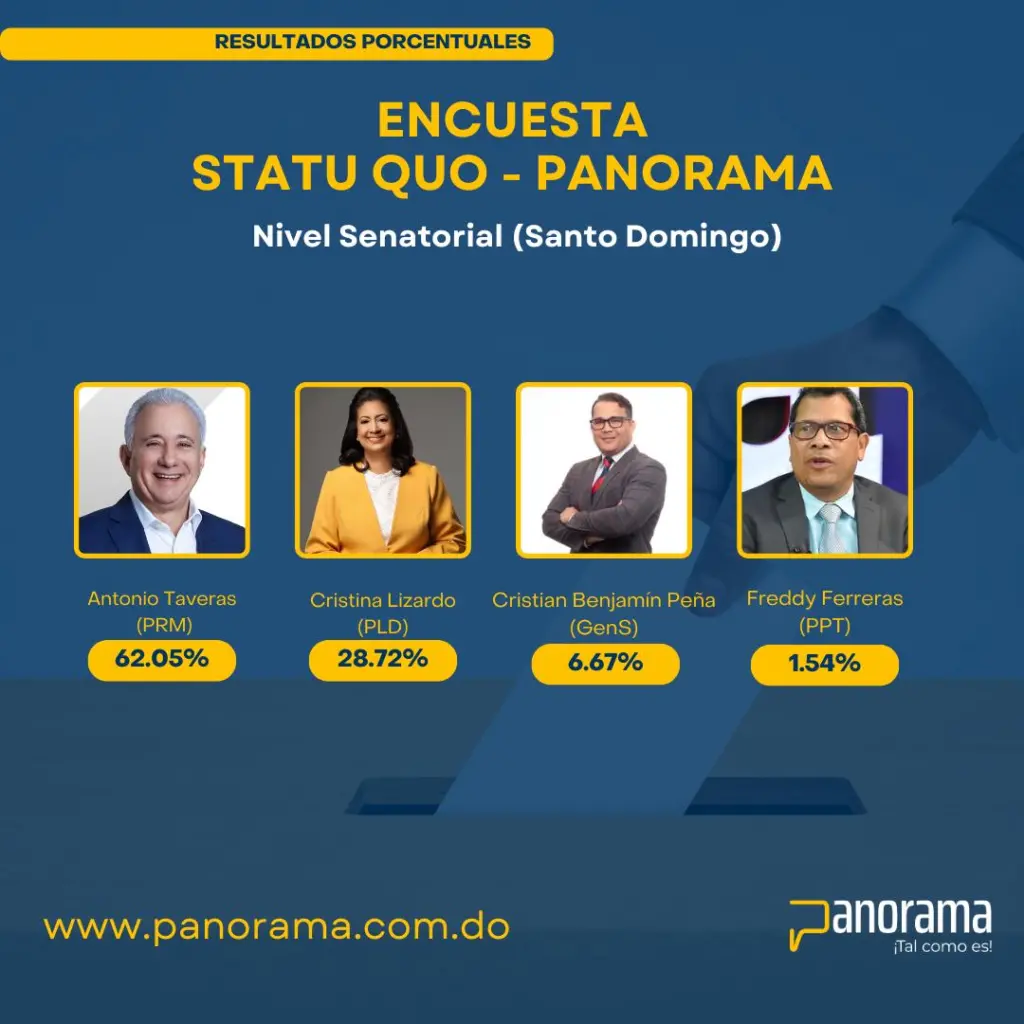 En la provincia de Santo Domingo, el candidato del Partido Revolucionario Moderno (PRM) y actual senador Antonio Taveras, lidera con un 62.05%. frente a Cristina Lizardo con un 28.72% como candidata de la Alianza Opositora Rescate RD, integrada por los partidos de la Liberación Dominicana (PLD), Revolucionario Dominicano (PRD) y Fuerza del Pueblo (FP). Este margen de intención de votos dificultaría las cosas para Cristina Lizardo.