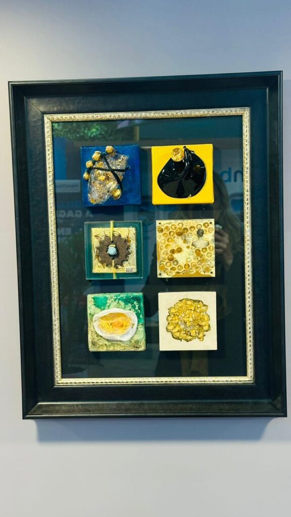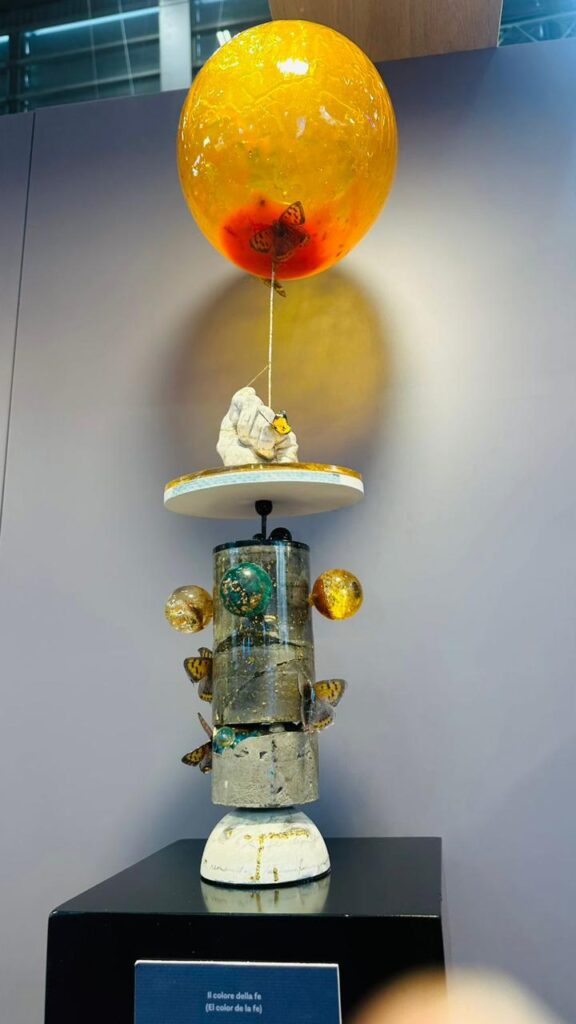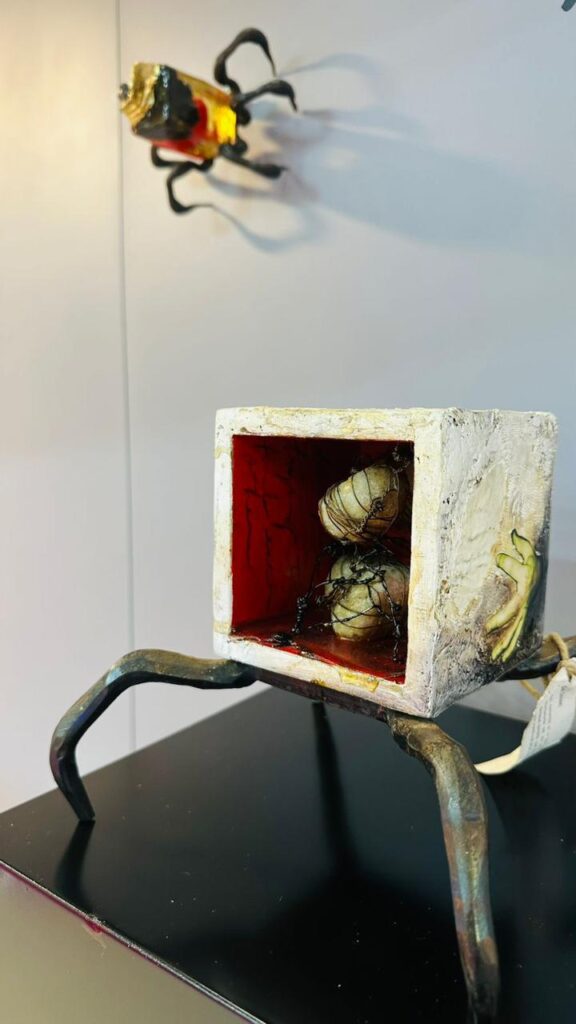 La muestra reúne pinturas, esculturas, collages, fotografías y objetos reciclados elaborados con metales, resinas y cerámicas, donde la artista combina técnicas clásicas y contemporáneas.