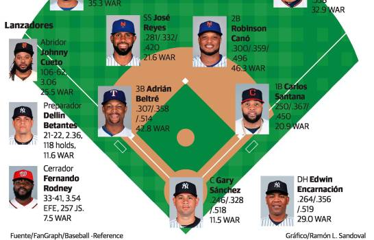 Abridor: Johnny Cueto. El petromacorisano sobresalió con foja de 106-62, 3.06 de efectividad, WHIP de 1.14, además de 1,266 ponches en 1,511 entradas y 25.5 WAR, el número 22 en toda la MLB. Detrás suyo quedaron Ubaldo Jiménez (18.5 WAR), Francisco Liriano (17.7), Bartolo Colón (17.3) y Ervin Santana (16.4).
