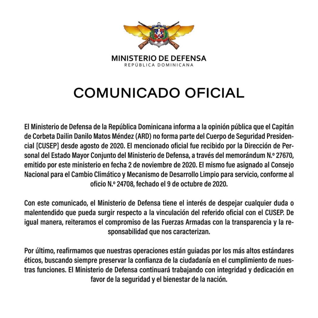 Panorama Nacional.- El Ministerio de Defensa de la República Dominicana aseguró este miércoles que el capitán de corbeta Dailin Danilo Matos Méndez (ARD) no guarda relación con el Cuerpo de Seguridad Presidencial (Cusep), ya que no forma parte del CUSEP desde agosto de 2020.