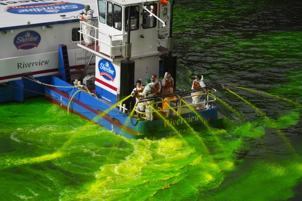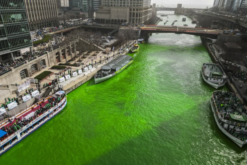 Miles de personas se alinearon a lo largo del río y abarrotaron los puentes el sábado, estallando en vítores cuando miembros del Sindicato de Plomeros de Chicago Local 130 rociaron tinte en el agua desde botes, continuando una tradición que comenzaron hace aproximadamente 63 años.