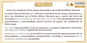 Según el comunicado de la Junta Central Electoral (JCE), se permitirá el uso de celulares u otros dispositivos electrónicos para hacer constar la veracidad de los escrutinios, por los representantes de los/las precandidatos/as.