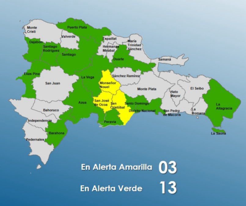 Panorama Nacional. El Centro de Operaciones de Emergencias (COE) aumentó a tres provincias en alerta amarilla y 12, junto al Distrito Nacional, en alerta verde, debido a las lluvias que continúan registrándose en el país.