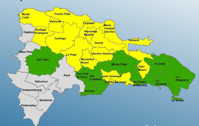 La entidad subrayó que en alerta amarilla se encuentran María Trinidad Sánchez, Santiago, Duarte (en especial el Bajo Yuna), Puerto Plata, Hermanas Mirabal, Hato Mayor, Valverde, Distrito Nacional, Monseñor Nouel, La Vega, Sánchez Ramírez, Espaillat, Samaná, Monte Cristi, Santo Domingo y Santiago Rodríguez.