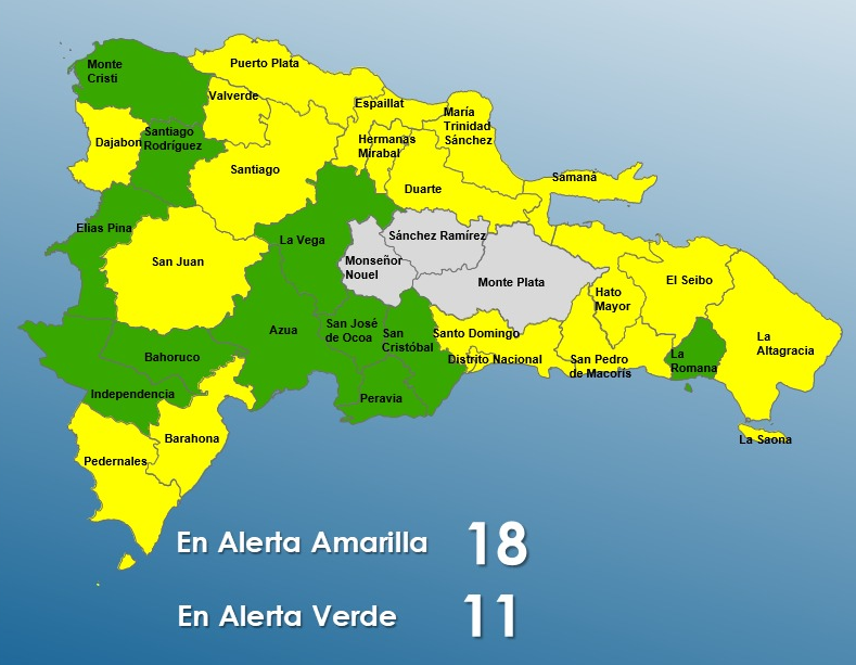 En alerta verde están Independencia, Elías Piña, La Vega, San Cristóbal, La Romana, Santiago Rodríguez, Monte Cristi, Azua, San Pedro de Macorís, San José de Ocoa, Peravia y Bahoruco.