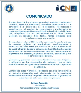Santo Domingo, RD. – Deligne Ascensión, presidente de la Comisión Nacional de Elecciones Internas del Partido Revolucionario Moderno (PRM), emitió un comunicado previo a las primarias en el que expresó el agradecimiento a los militantes y dirigentes del partido, quienes expresó que han acatado las disposiciones de la Junta Central Electoral (JCE) y han contribuido al fortalecimiento de la democracia.