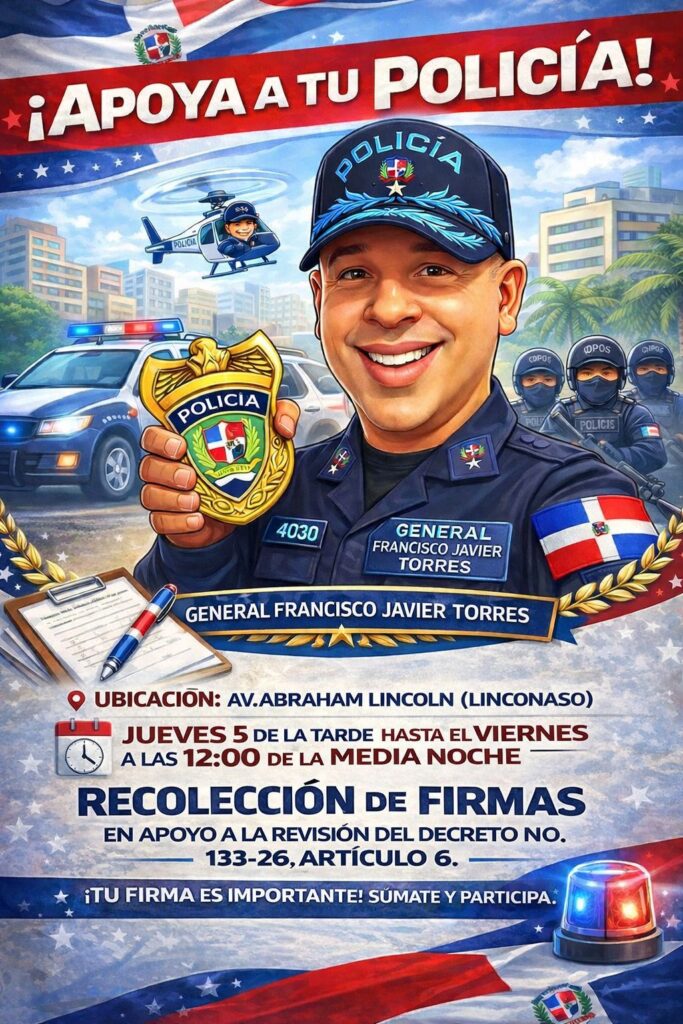 La iniciativa, promovida bajo el lema “¡Apoya a tu Policía!”, invita a participar en una jornada de recolección de firmas en apoyo a la revisión del Decreto No. 133-26, específicamente en lo relativo a su artículo 6.