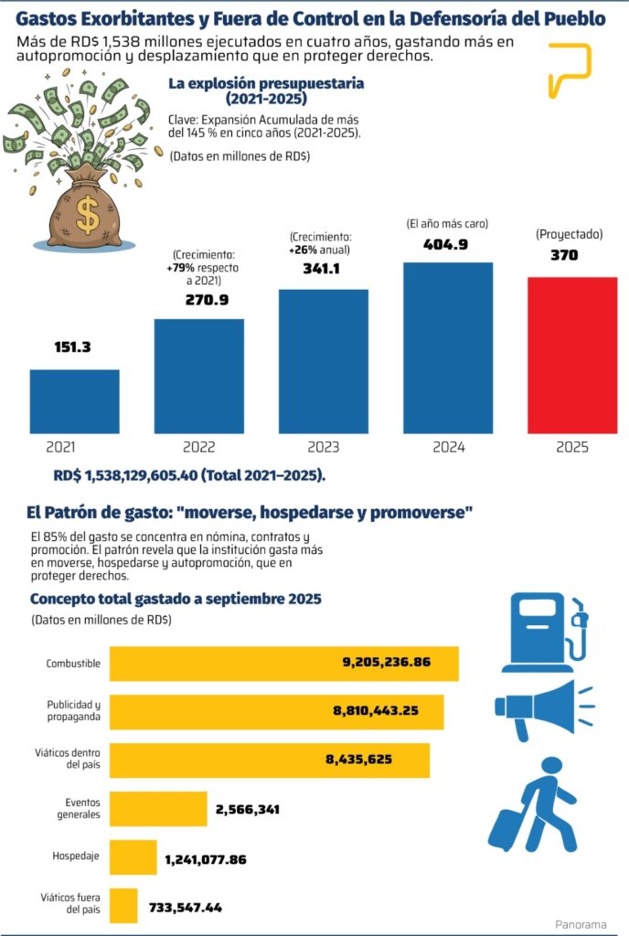 En apenas cuatro años de gestión, su administración ha ejecutado más de RD$ 1,538 millones de pesos, una cifra que, lejos de reflejar eficiencia social, exhibe un patrón de gasto concentrado en publicidad, nómina, servicios contratados, seguridad y combustibles.