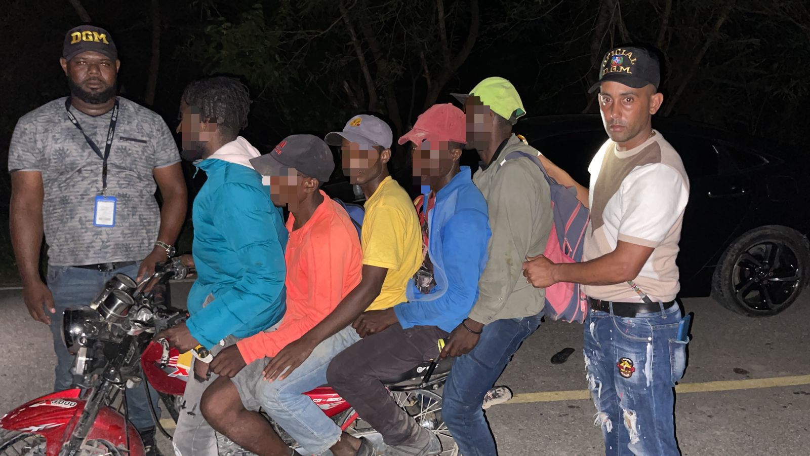 En el grupo fue detenido un dominicano que participaba en el delito migratorio, quien en su motocicleta llevaba 4 indocumentados. La DGM indicó que será sometido a la justicia por violación de la Ley 285-04.