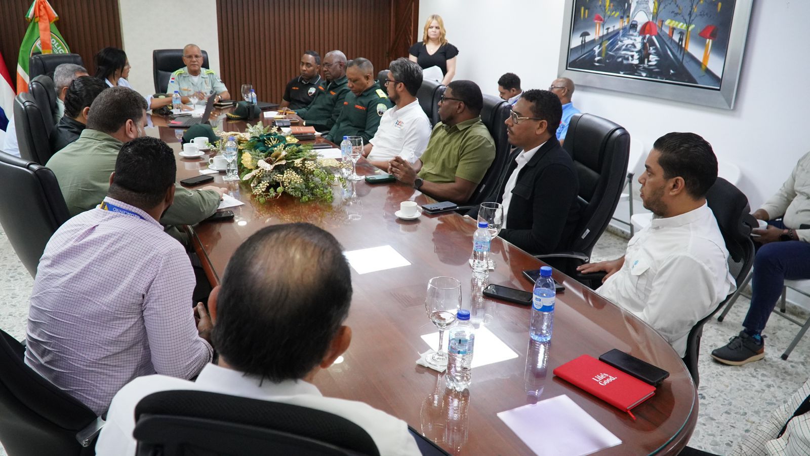 Durante la reunión estuvieron presentes: la directora de Movilidad Sostenible del Intrant, ingeniera Alexandra Cedeño; el ingeniero Darío Domínguez, del Ayuntamiento D.N.; el subdirector operativo de la Digesett, coronel Salvador Moreno Jaques; director de Centro de Mando y Control, coronel Pedro José Valdez María; el subdirector de Planificación, ingeniero Alejandro Piñeiro; el encargado de Comunicaciones, coronel Rafael Tejeda Baldera; entre otros.