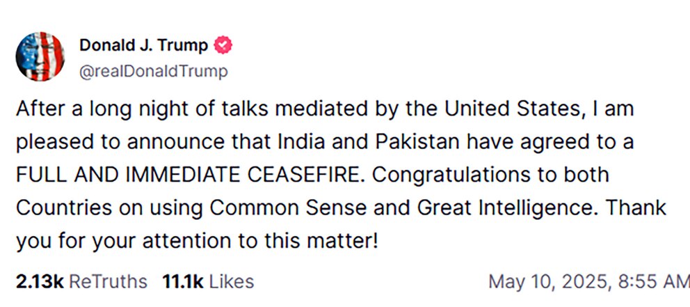 “Tras una larga noche de conversaciones con la mediación de Estados Unidos, me complace anunciar que India y Pakistán han acordado un ALTO AL FUEGO TOTAL E INMEDIATO”, declaró Trump en Truth Social, elogiando a ambos países por “utilizar el sentido común y la inteligencia”.