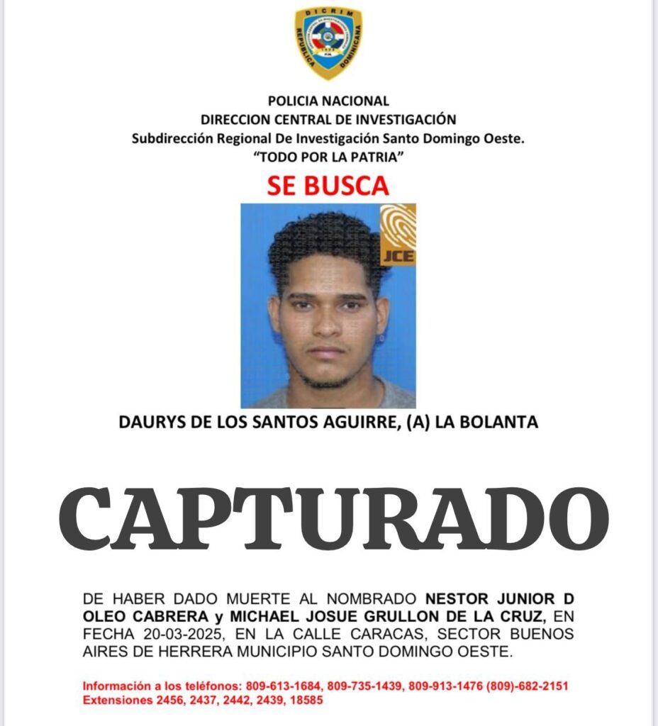 Mientras que el segundo de los detenidos es Daurys de los Santos Aguirre, alias La Volanta, de 29 años, quien se entregó en la División de Homicidios en Las Caobas, Santo Domingo Oeste.