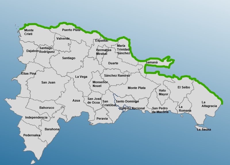El COE agregó que la alerta verde abarca toda la franja costera atlántica, desde Bahía de Manzanillo, en la provincia Montecristi, hasta Cabo San Rafael, en La Altagracia.