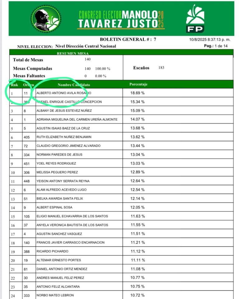 El suplente técnico de la JCE y vicesecretario asuntos municipales Alberto Antonio Ávila Rosario, del equipo político de Víctor Pavón, se convirtió en el candidato más votado en las elecciones internas para escoger a los nuevos miembros de la Dirección Central Nacional de la Fuerza del Pueblo, consolidando así su liderazgo dentro de la organización.