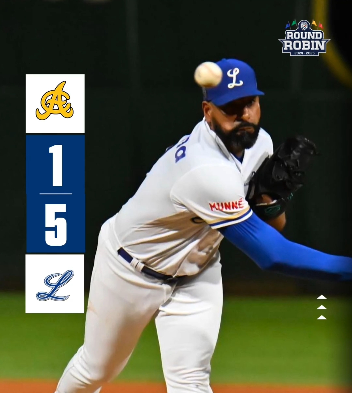 La ofensiva azul explotó ante el relevista Maríñez al fabricar cuatro carreras. Hensley se ponchó para el primer out. Alcántara ligó imparable al central. Francisco Mejía lo imitó por el mismo lugar. Domingo Leyba despachó un largo cuadrangular de tres vueltas por todo lo largo del jardín de la derecha. Gustavo Núñez conectó triple por el central decretando la salida del box de Maríñez. El relevista Sam McWilliams se hace cargo de la situación. Emilio Bonifacio pegó un elevado de sacrificio al left anotando Núñez desde la antesala.