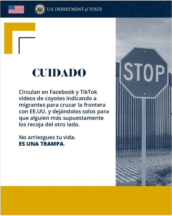 “Cuidado: circulan en Facebook y TikTok videos de coyotes indicando a migrantes para cruzar la frontera con EE.UU. y dejándonos solos para que alguien más supuestamente los recoja del otro lado”, cita el mensaje publicado.