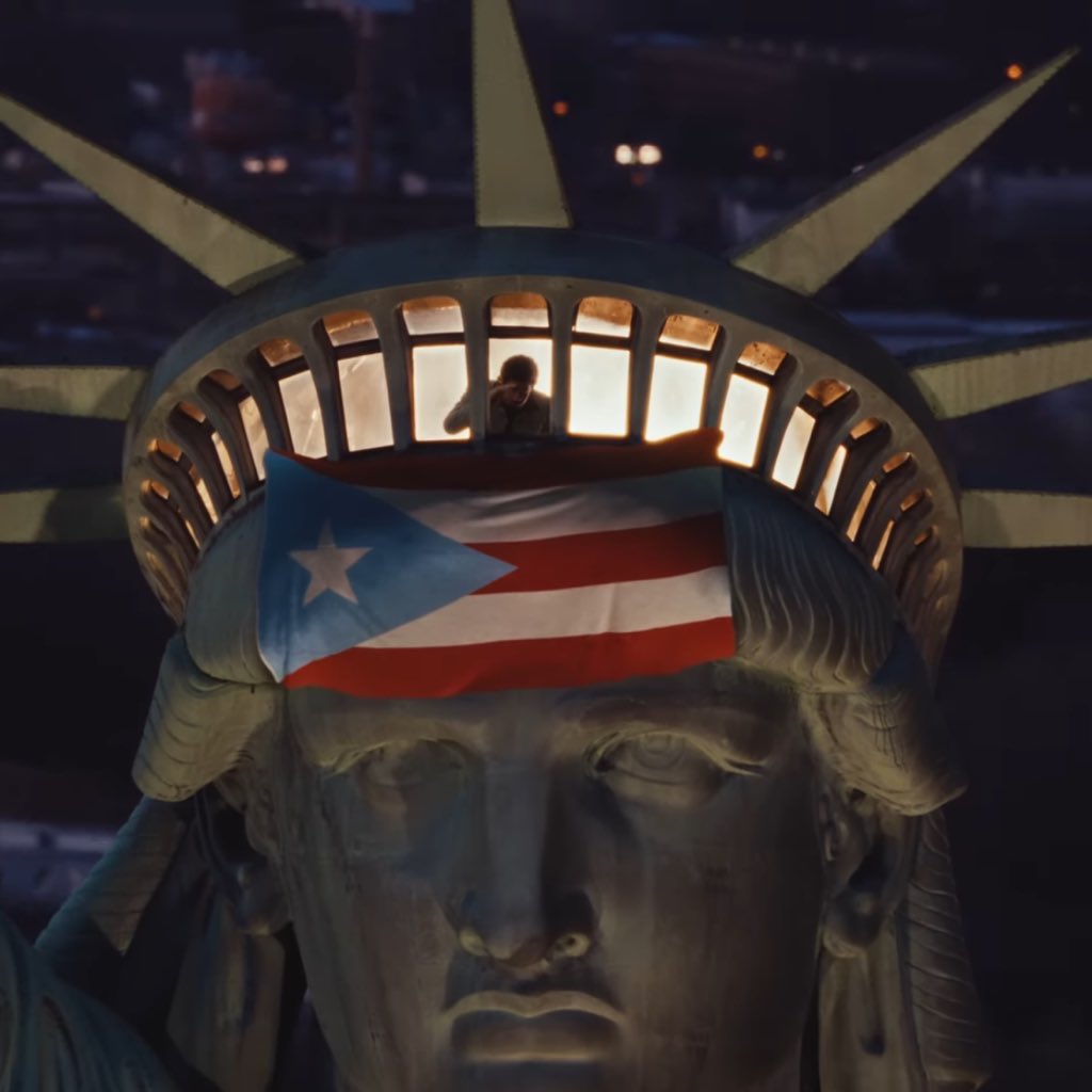 En el video, también aparece la Estatua de la Libertad con la bandera de Puerto Rico en la frente y con el azul de la misma en color celeste, que es el tono utilizado por aquellos que rechazan la anexión de la isla a EE.UU.