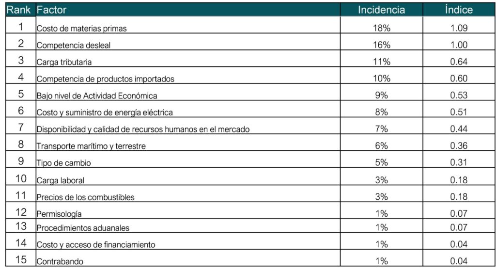 En posición que puede considerarse intermedia se ubicaron factores como la competencia de productos importados, el bajo nivel de la actividad económica y al costo y suministro de energía eléctrica, los cuales afectaron la competitividad, aunque en menor medida que los antes mencionados.