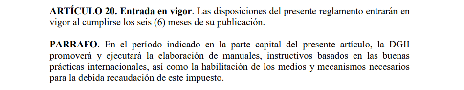La orden núm. 30-25, que aprueba el Reglamento que Regula la Percepción y Aplicación del Impuesto sobre Transferencias de Bienes Industrializados y Servicios (ITBIS), en los servicios ofrecidos a través de plataformas digitales consumidos en la Republica dominicana y que son prestados por proveedores del exterior. G. O., de fecha 25 de enero, fue colgada en la Gaceta Oficial y dispone su entrada en vigor a partir del mes de julio según cita su artículo 20.