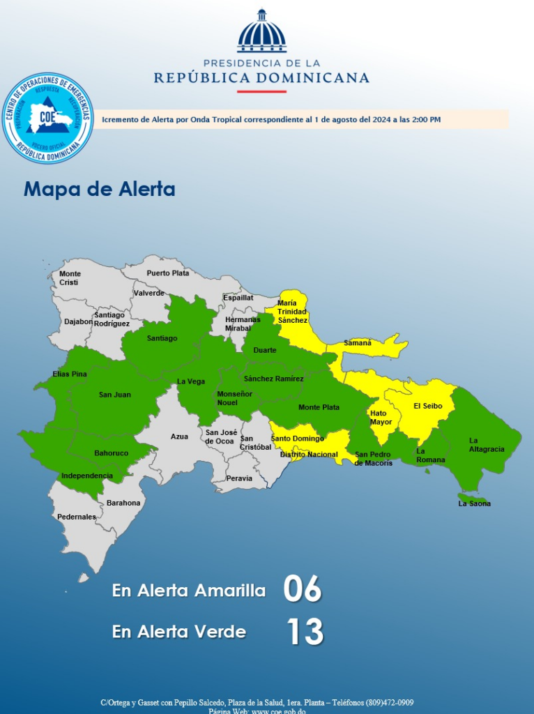 Mientras que en alerta verde están Bahoruco, Sánchez Ramírez, Monseñor Nouel y San Pedro de Macorís. Además, Santiago, Monte Plata, Independencia, La Vega, San Juan, Elías Piña, Santiago, La Altagracia, La Romana y Duarte.