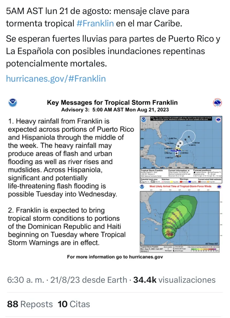 El Centro Nacional de Huracanes de EE. UU. pronosticó la mañana de este lunes “posibles inundaciones repentinas potencialmente mortales” para República Dominicana, Haití y Puerto Rico por las fuertes lluvias que se esperan debido a la tormenta tropical Franklin.