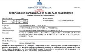 Adicionalmente, se encontró un certificado de disponibilidad de cuota, fechado en diciembre de 2022, donde el Ministerio Administrativo de la Presidencia realizó un pago de 99 millones 414 mil pesos a Centro Cuesta Nacional por la compra de kits de alimentos destinados a personas vulnerables afectadas por el huracán Fiona.