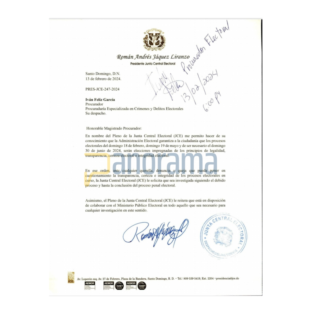 El presidente de la Junta Central Electoral (JCE), Román Andrés Jáquez Liranzo, envió una comunicación al Procurador de la Procuraduría Especializada en Crímenes y Delitos Electorales, Iván Feliz García. La misiva, enviada la tarde de este martes, insta al funcionario a investigar las denuncias de los partidos que integran la Alianza Opositora Rescate RD, sobre un plan de sabotaje de cara a las elecciones municipales del domingo 18 de febrero.
