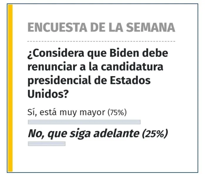 Panorama Resultado Encuesta. Según el sondeo realizado por Panorama, se les preguntó a los usuarios lo siguiente: ¿Considera que Biden debe retirar su candidatura presidencial de los Estados Unidos?