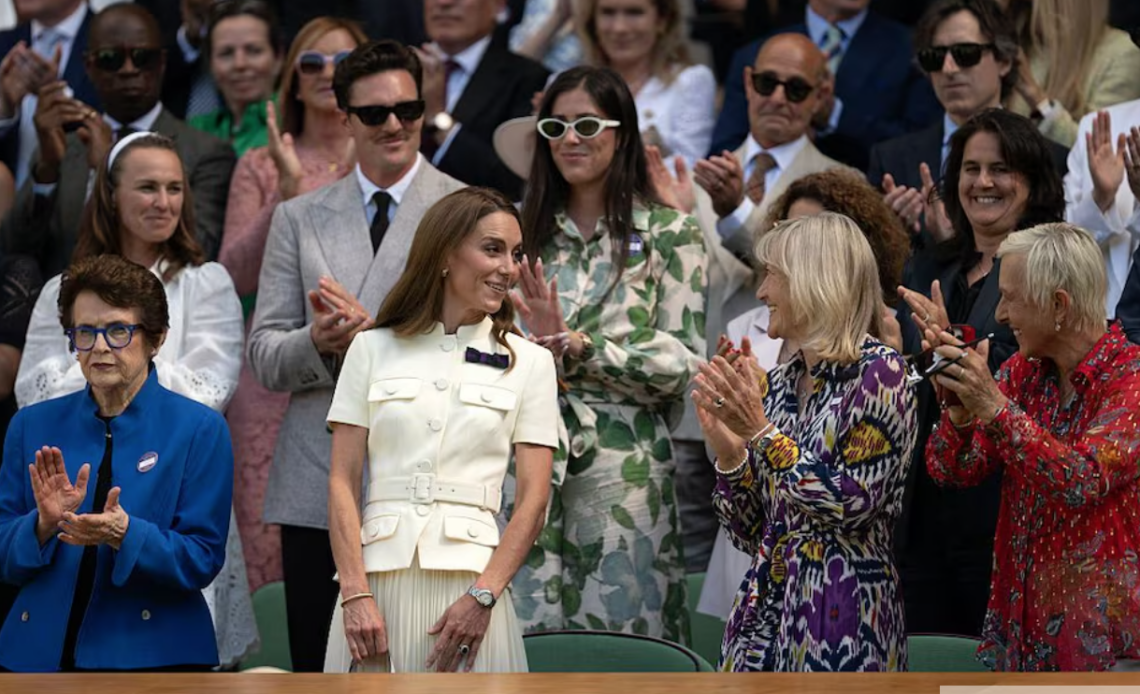 Este pequeño emblema, colocado en la solapa, es símbolo de pertenencia y tradición, y refuerza su vínculo con el torneo más prestigioso del tenis mundial. Curiosamente, volvió a llevar en su dedo anular el icónico anillo de compromiso, ausente en sus últimas apariciones públicas. En su muñeca, Kate volvió a lucir el elegante Cartier Ballon Bleu que le regaló el príncipe Guillermo con motivo de su tercer aniversario de bodas, un gesto de cariño que se ha convertido en uno de sus complementos más emblemáticos.