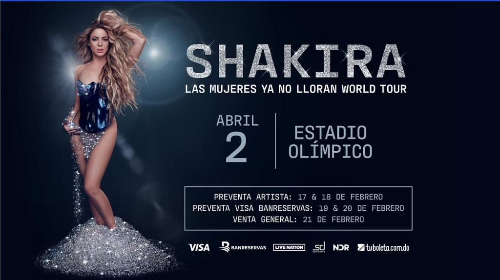 Panorama musical. La cantante colombiana Shakira llegará al Estadio Olímpico de Santo Domingo con su tan esperada gira «Las Mujeres Ya No Lloran World Tour», este 2 de abril. La información fue dada a conocer por el SD Concerts y tuboleta.com.do.
