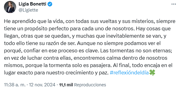 En su publicación, Bonetti afirmó: «He aprendido que la vida, con todas sus vueltas y sus misterios, siempre tiene un propósito perfecto para cada uno de nosotros. Hay cosas que llegan, otras que se quedan, y muchas que inevitablemente se van, y todo ello tiene su razón de ser. Aunque no siempre podamos ver el porqué, confiar en ese proceso es clave». El mensaje, fue acompañado por el hashtag #reflexióndeldía y un trébol de la suerte.
