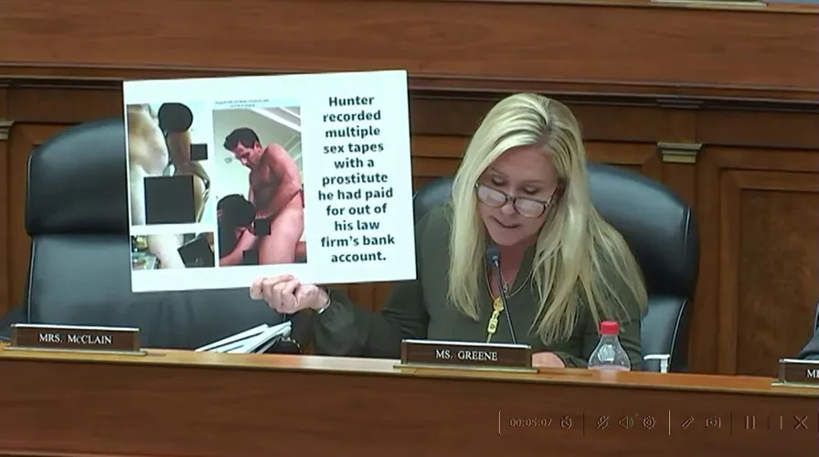 Durante su intervención, la legisladora mostró pequeños carteles con fotos sexuales gráficas del disco duro del portátil que supuestamente pertenecía a Hunter Biden. Los rostros de las personas implicadas en los actos sexuales fueron censurados con recuadros negros, a excepción de la cara del hijo del mandatario.