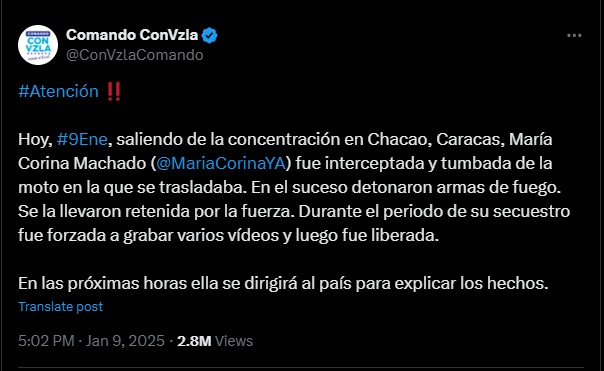 En un comunicado publicado en su cuenta oficial de X (anteriormente Twitter), el Comando reveló que durante su cautiverio, Machado fue forzada a grabar el video que circula en redes sociales en el que aseguraba estar a salvo.