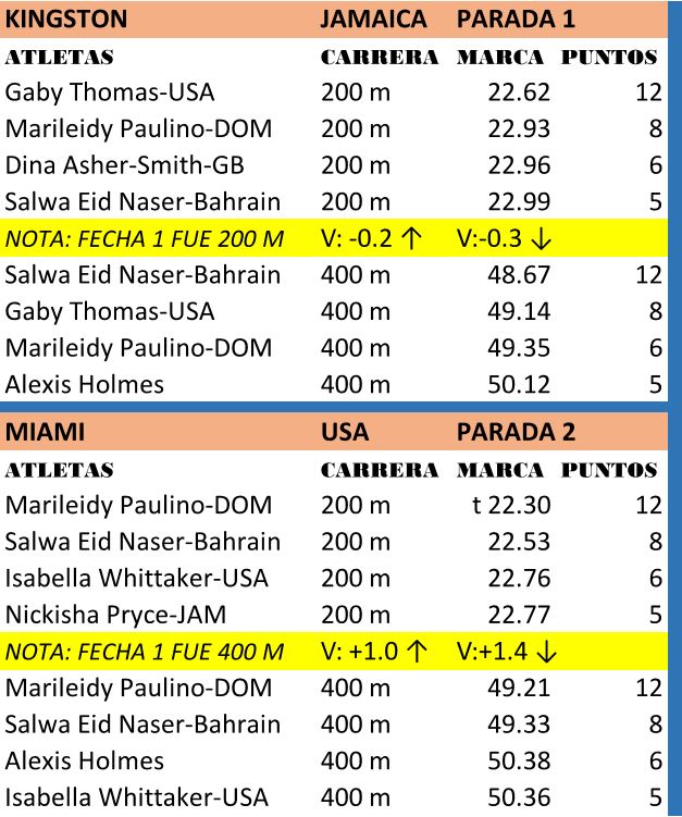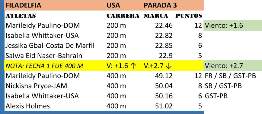 Todo luce que para la dominicana este es el resultado más beneficioso, pues cuando en Jamaica la primera prueba fue la de 200 metros, terminó en segundo lugar y en la de 400 metros fue tercera.