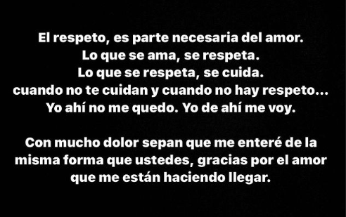 En sus historias de Instagram, la artista expresó: «El respeto es parte necesario del amor. Lo que se ama, se respeta. Lo que se respeta, se cuida. Cuando no te cuidan y cuando no hay respeto… Yo ahí no me quedo. Yo de ahí me voy. Con mucho dolor sepan que me enteré de la misma forma que ustedes, gracias por el amor que me están haciendo llegar».