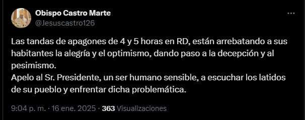“Las tandas de apagones de 4 y 5 horas en RD están arrebatando a sus habitantes la alegría y el optimismo, dando paso a la decepción y al pesimismo”, escribió el obispo.