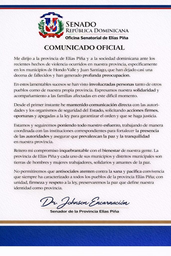 Panorama Nacional. – El senador de la provincia Elías Piña, Johnson Encarnación, lamentó este jueves los recientes hechos de violencia registrados en esa provincia y expresó su solidaridad con las familias de las víctimas, al tiempo que reiteró su compromiso con la preservación de la paz y el orden en la zona fronteriza.