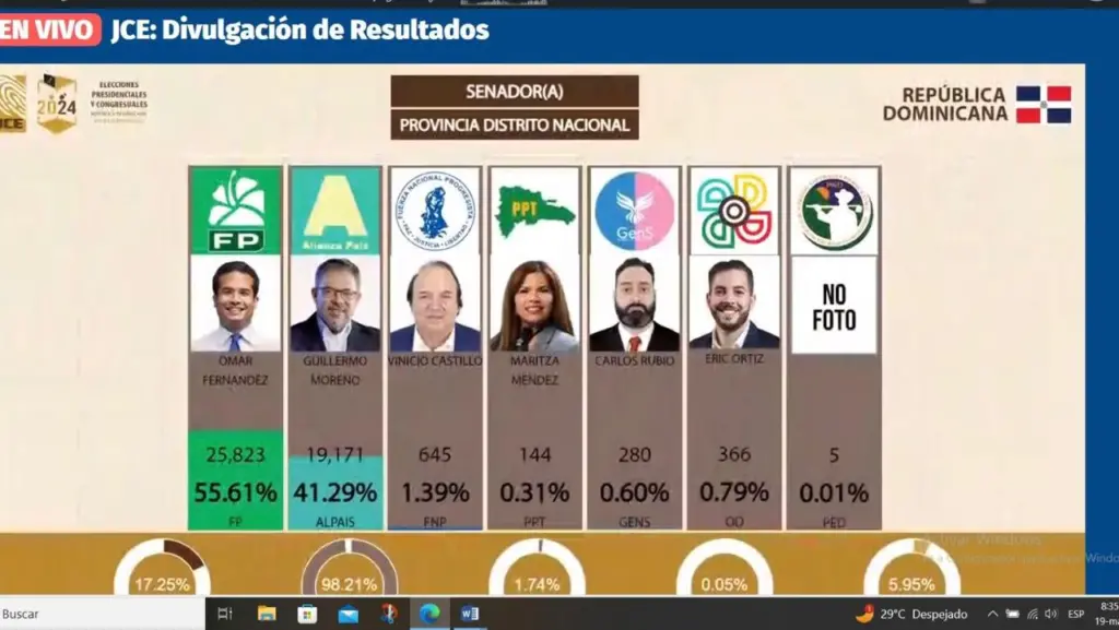 Panorama Nacional.-De acuerdo con los resultados del primer boletín de votos emitidos en las Elecciones Congresuales y Presidenciales de 2024, y basándonos en la proyección visualizada, el oficialismo obtendría la mayor parte de los senadores del país, seguido por el Partido de la Liberación Dominicana (PLD) y la Fuerza del Pueblo (FP).