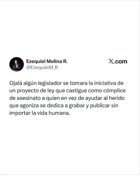 “Ojalá algún legislador se tomara la iniciativa de un proyecto de ley que castigue como cómplice de asesinato a quien en vez de ayudar al herido que agoniza se dedica a grabar y publicar sin importar la vida humana”, expresó el líder religioso en la red social X.
