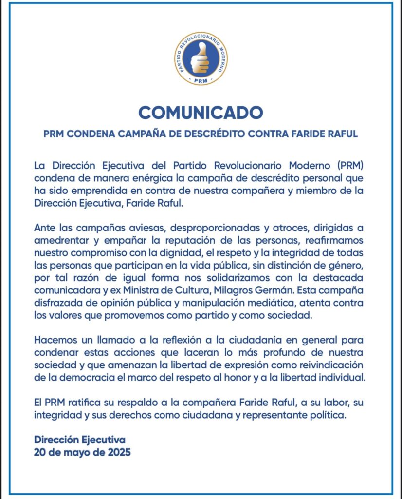 Panorama Nacional. – El Partido Revolucionario Moderno (PRM) expresó este martes su enérgico rechazo a lo que calificó como una campaña de descrédito personal contra la ministra de Interior y Policía, Faride Raful, a quien manifestó su total respaldo.