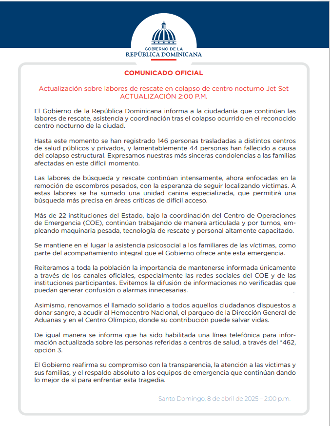 Panorama Nacional. A través de un comunicado oficial, las autoridades informan que tras el desplome de la estructura del club nocturno Jet Set, hasta el momento 44 personas han fallecido y 146 han sido rescatadas y enviadas a los diferentes centros de salud.