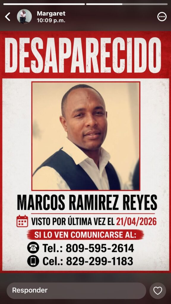 Sus familiares se mantienen desconcertados y con pesadumbre, y solicitan la colaboración de la ciudadanía para dar con su paradero. Para cualquier dato o información que permita localizar a Marcos Ramírez Reyes, favor comunicarse a los teléfonos: (809)595-2614 (residencia) y (829)299-1183 (hermana).