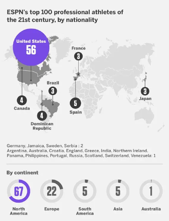 Sí, clasificar a los 100 atletas más exitosos desde el año 2000 no fue tan fácil después de todo, pero seguro que fue divertido. Hace veinticinco años, el proyecto SportsCentury de ESPN clasificó a los 100 mejores atletas norteamericanos del siglo XX. Michael Jordan llegó primero, seguido por Babe Ruth, Muhammad Ali, Jim Brown y Wayne Gretzky. (Ruth debería haber sido la número 1, pero bueno, soy un escritor de béisbol). También clasificamos un caballo: Secretary quedó en el puesto 35.