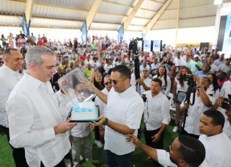 Sorprenden al presidente con un bizcocho por su cumpleaños en entrega títulos de propiedad